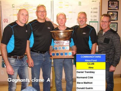 La classe A, du Tournoi provincial de curling de la Coupe Molson Dry d'Alma 2018 a été remporté par l'équipe composée de Daniel Tremblay, Normand Côté, Steve Mailhiot et Donald Gérin.